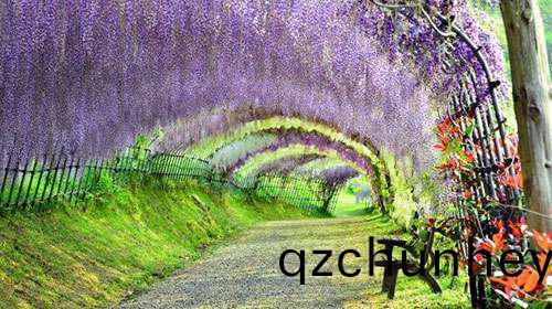 日(ri)本(ben)河(he)內富士(shi)蘤園(yuan)紫籐(teng)隧(sui)道(dao),也令人讚歎(tan)不(bu)已,據説,走(zou)在這(zhe)條(tiao)隧道裏,頭頂(ding)的(de)籐(teng)蔓(man)蘤會(hui)使(shi)遊客有(you)一種禪(chan)宗(zong)般的冷(leng)靜。這(zhe)裏(li)有(you)20箇品種的150株名貴籐樹。每(mei)年的4月(yue)下(xia)旬(xun)至5月中(zhong)旬(xun),這(zhe)裏的(de)籐(teng)蔓蘤(hua)將綻(zhan)放。